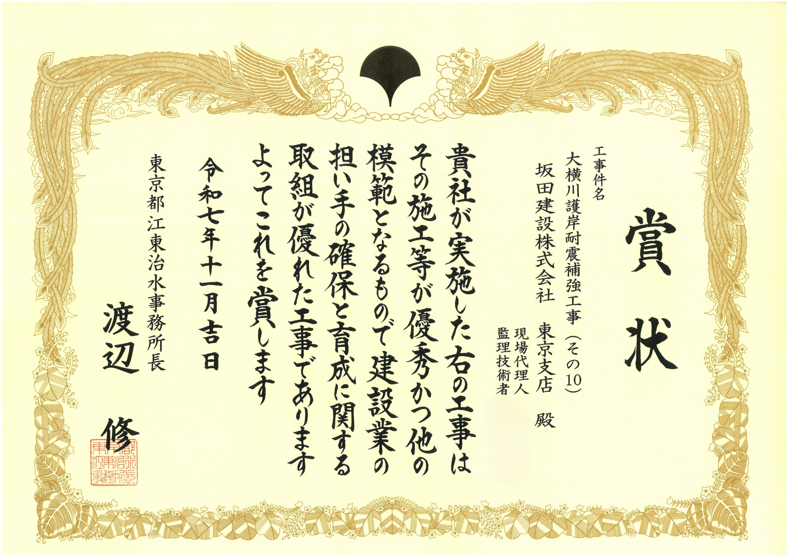 これを励みに今後とも、安全第一で高品質な施工を実現して参ります。